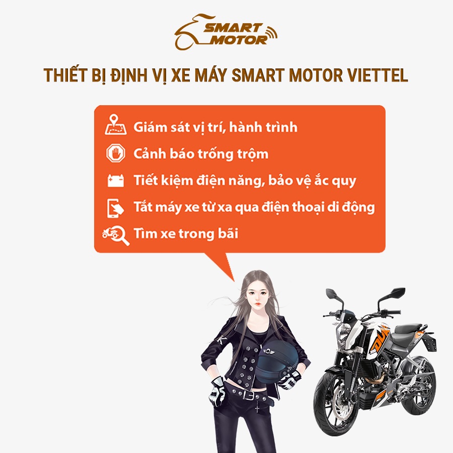 - Thiết bị định vị xe máy Smart Motor Viettel với chức năng giám sát và chống trộm xe máy thông minh qua mạng di động Viettel và hệ thống định vị toàn cầu GPS. Ứng dụng trên điện thoại với nhiều tiện ích như theo dõi vị trí xe, bảo vệ chống trộm, tắt máy từ xa…..